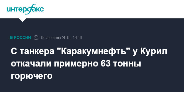 "С аварийного танкера "Каракумнефть", сидящего на мели в Курильском заливе, на 21:00 19 февраля откачали 65 кубометров, или примерно 63 тонны дизтоплива", - отметил собеседник агентства.