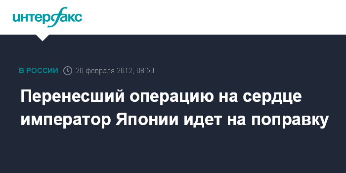 Токио. 20 февраля. INTERFAX.RU - Император Японии Акихито, которому 18 февраля было сделано коронарное шунтирование, идет на поправку, утром в понедельник врачи перевели его из отделения интенсивной терапии в обычную палату, передает японская телекомпания NHK.