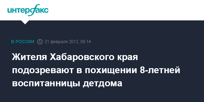 Хабаровск. 21 февраля. INTERFAX.RU - Уголовное дело по факту похищения из детдома 8-летней девочки возбуждено в Хабаровском крае, сообщает СУ СК РФ по региону во вторник.