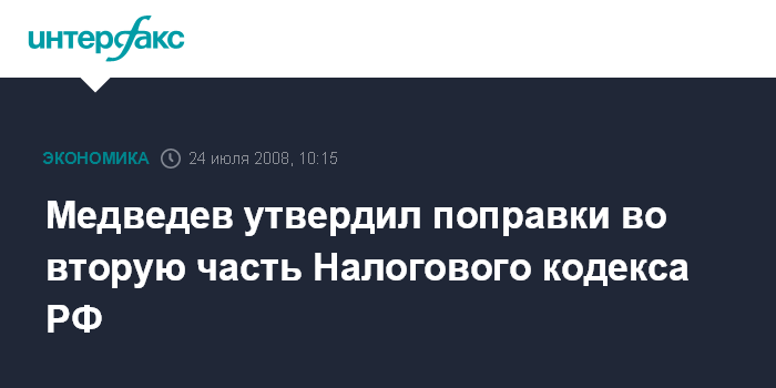 Москва. 24 июля. INTERFAX.RU - Президент России Дмитрий Медведев подписал федеральный закон "О внесении изменений в главы 21, 23, 24, 25 и 26 части второй Налогового кодекса Российской Федерации и некоторые другие акты законодательства Российской Федерации о налогах и сборах", сообщает пресс-служба главы государства.