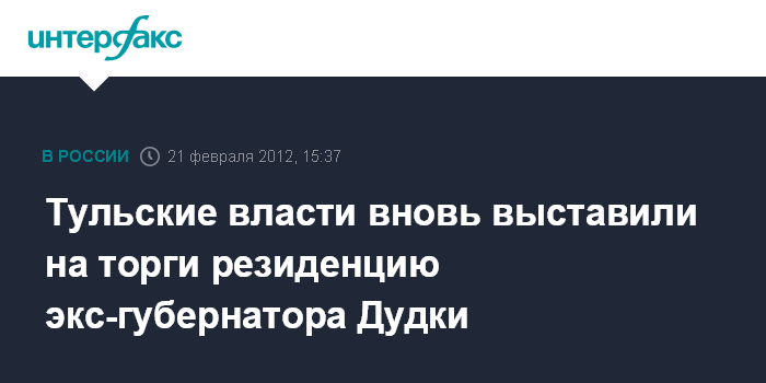 Тула. 21 февраля. INTERFAX.RU - Правительство Тульской области повторно выставило на аукцион резиденцию бывшего губернатора Вячеслава Дудки для сдачи в аренду, сообщили "Интерфаксу" во вторник в облправительстве.