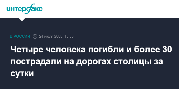 Москва. 24 июля. INTERFAX.RU - За прошедшие сутки в Москве зарегистрировано 31 дорожно-транспортное происшествие, в котором 4 человека погибли и 34, в том числе 1 ребенок, получили травмы, сообщили "Интерфаксу" в управлении ГИБДД столицы в четверг.