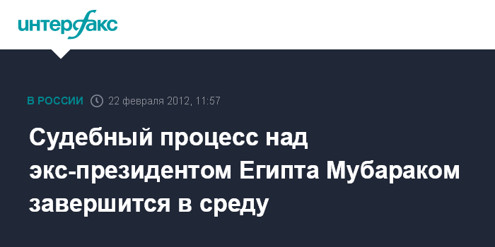 Каир. 22 февраля. INTERFAX.RU - Заключительная судебная сессия по делу бывшего президента Египта Хосни Мубарака, затянувшаяся на полгода, состоится в среду, сообщает египетская газета "Аль-Ахрам".