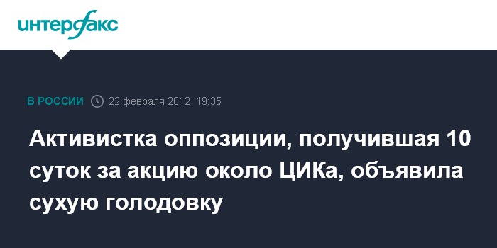 Москва. 22 февраля. INTERFAX.RU - Одна из активисток, которую в среду московский суд приговорил к десяти суткам ареста за митинг у здания Центризбиркома, заявила о начале сухой голодовки.