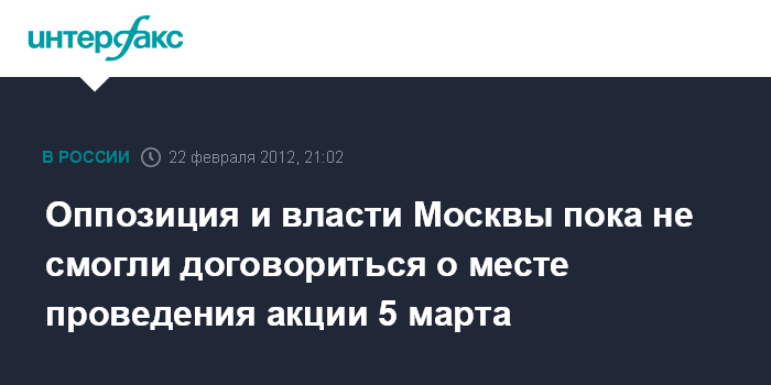 Москва. 22 февраля. INTERFAX.RU - Организаторы акции оппозиции, запланированной на 5 марта, пока не достигли компромисса с мэрией Москвы о месте ее проведения.