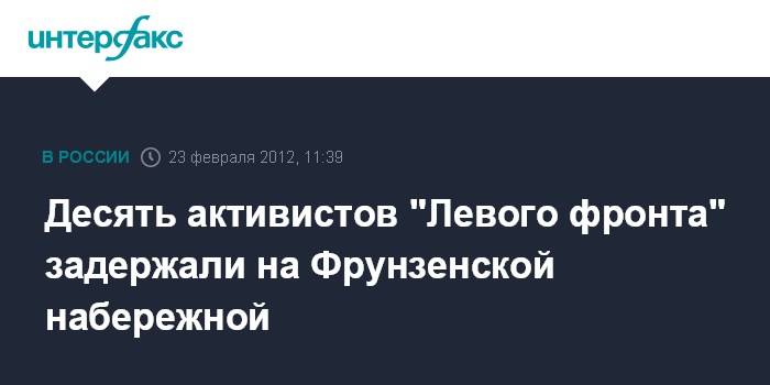 Москва. 23 февраля. INTERFAX.RU - В оппозиции заявили о задержании 10 активистов "Левого фронта" на Фрунзенской набережной. "На Фрунзенской набережной задержали 10 активистов "Левого фронта", которые общались с участниками путинского шествия. Увели их в автобус, проверяют", - сообщил в "Твиттере" лидер "Левого фронта" Сергей Удальцов. В полиции его сообщение пока не комментируют.