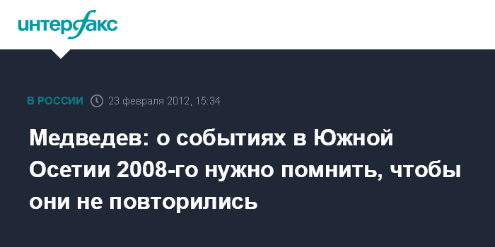 Ильинское (Московская область). 23 февраля. INTERFAX.RU - Президент России Дмитрий Медведев считает необходимым сохранять память о событиях августа 2008 года в Южной Осетии для того, чтобы подобные военные конфликты никогда не повторялись.