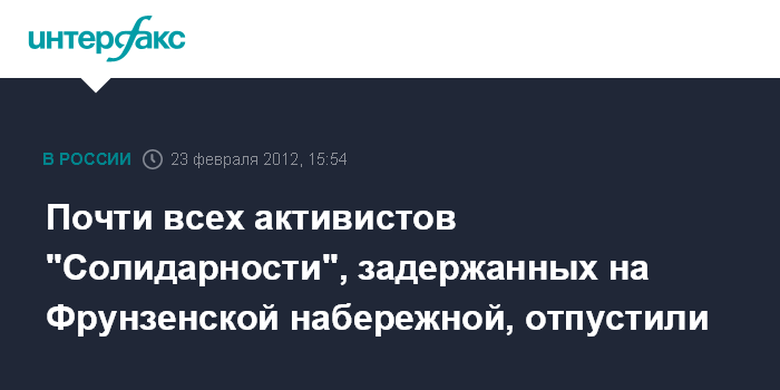 Москва. 23 февраля. INTERFAX.RU - Полиция отпустила девятерых из 11 активистов оппозиционного движения "Солидарность", которые были задержаны в четверг утром на Фрунзенской набережной перед митингом в поддержку Владимира Путина. "Мы только что вышли из ОВД "Хамовники". Нас там продержали некоторое время и отпустили, не оформляя никаких протоколов", - сообщила "Интерфаксу" активистка "Солидарности" Надежда Митюшкина.