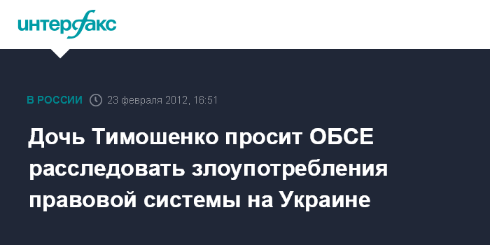 Киев. 23 февраля. INTERFAX.RU - Дочь экс-премьера Украины Евгения Тимошенко призывает Организацию по безопасности и сотрудничеству в Европе (ОБСЕ) провести расследование фактов злоупотреблений, совершаемых в правовой системе страны.