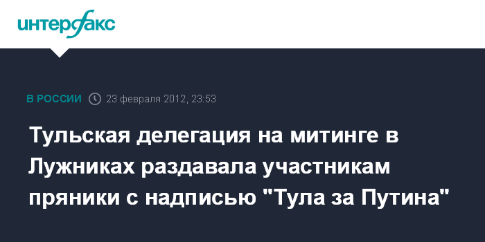 В ходе митинга туляки раздали его участникам привезенные с собой пряники с надписью "Тула за Путина", всего более 2 тыс. штук, отметил собеседник агентства.