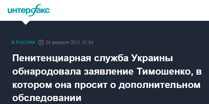 Киев. 24 февраля. ИНТЕРФАКС-УКРАИНА - Государственная пенитенциарная служба Украины обнародовала заявление экс-премьера Юлии Тимошенко, в котором она просила о дополнительном медицинском обследовании.