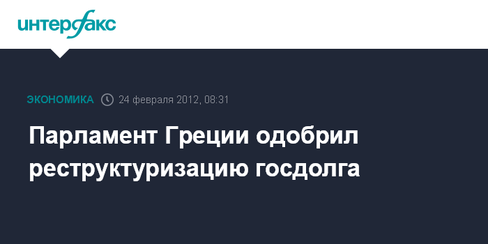 Афины. 24 февраля. INTERFAX.RU - Парламент Греции в четверг одобрил программу реструктуризации госдолга, которая предусматривает обмен существующих облигаций на новые со списанием более чем 50% их номинальной стоимости.