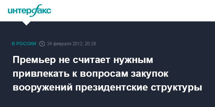Саров. 24 февраля. INTERFAX.RU - Премьер РФ Владимир Путин считает, что вопросы закупок вооружений должны находиться под прямым контролем главы правительства, не видит необходимости подключать к этому контролю президентские структуры.