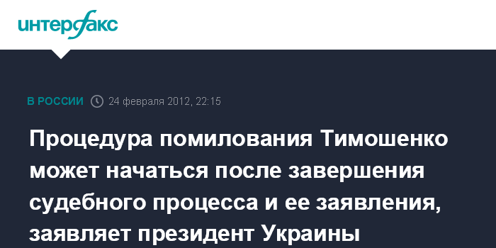 Киев. 24 февраля. ИНТЕРФАКС-УКРАИНА - Процедура помилования экс-премьера Юлии Тимошенко может быть начата после завершения судебного процесса над ней и в случае соответствующего заявления экс-премьера к президенту, заявляет глава Украины Виктор Янукович.