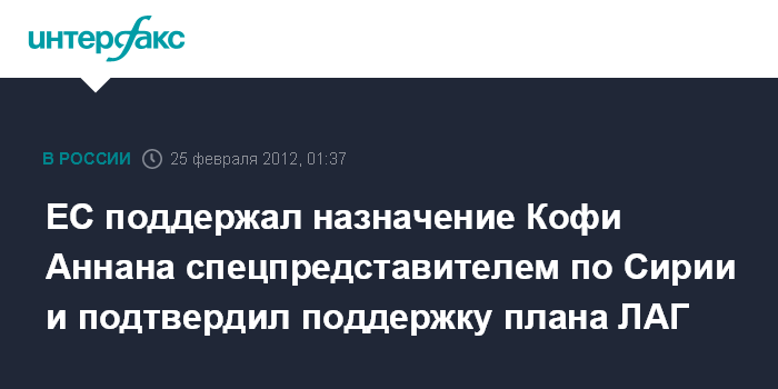 Брюссель. 25 февраля. ИНТЕРФАКС - Европейский союз поддержал назначение бывшего генерального секретаря ООН Кофи Аннана специальным представителем ООН и Лиги арабских государств (ЛАГ) по Сирии.