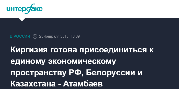Москва. 25 февраля. INTERFAX.RU - Киргизия решительно настроена на дальнейшую экономическую интеграцию на постсоветском пространстве, республика готова вступить в ЕврАзЭС, заявляет президент Алмазбек Атамбаев.
