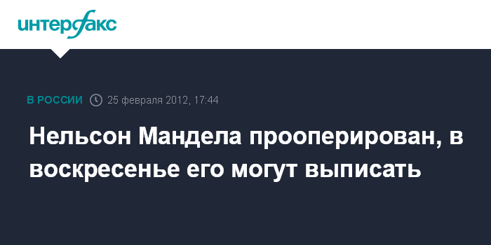 Лондон. 25 февраля. INTERFAX.RU - Бывшему президенту ЮАР Нельсону Манделе в субботу проведена хирургическая операция, он находится в нормальном состоянии и, возможно, будет выписан уже в воскресенье, сообщает британская телерадиокорпорация Би-би-си. Ранее сообщалось, что Н.Мандела в субботу был помещен в больницу на обследование в связи с жалобами на боли в области живота.