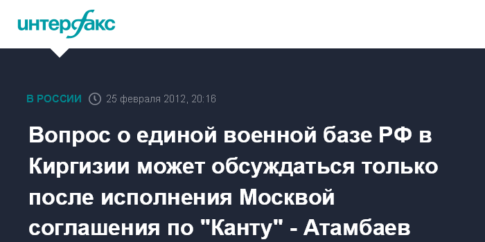 Москва/Бишкек. 25 февраля. ИНТЕРФАКС - Президент Киргизии Алмазбек Атамбаев считает, что решение вопроса об объедении российских военных объектов в республике в единую базу должно следовать за исполнением Москвой соглашения о размещении авиабазы в Канте.