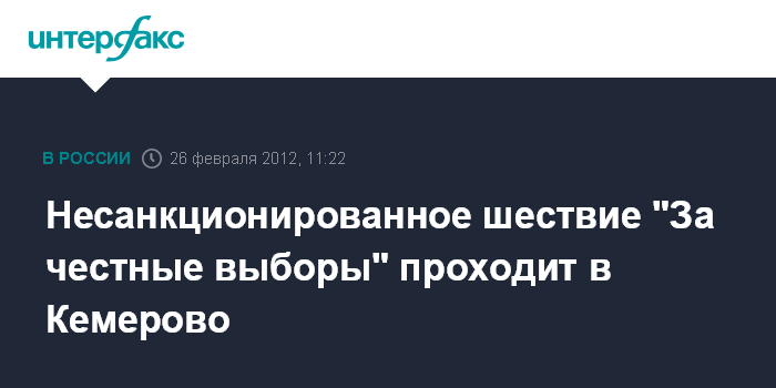 Кемерово. 26 февраля. INTERFAX.RU - Колонна примерно из 50 человек двинулись по улицам Кемерово в воскресенье в рамках шествия "За честные выборы", передает корреспондент агентства "Интерфакс-Сибирь". Шествие не было санкционировано властями.
