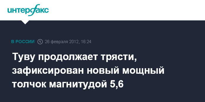 Новосибирск. 26 февраля. INTERFAX.RU - Геофизическая служба Сибирского отделения РАН зафиксировала новый мощный подземный толчок в Туве после серии более слабых землетрясений, говорится в сообщении службы. По данным сейсмологов, в 15:59 мск в месте с координатами 51.62 сев. широты 95.74 вост. долготы, в 90 км к востоку от Кызыла произошло землетрясение магнитудой 5,6 и энергетическим классом 14.