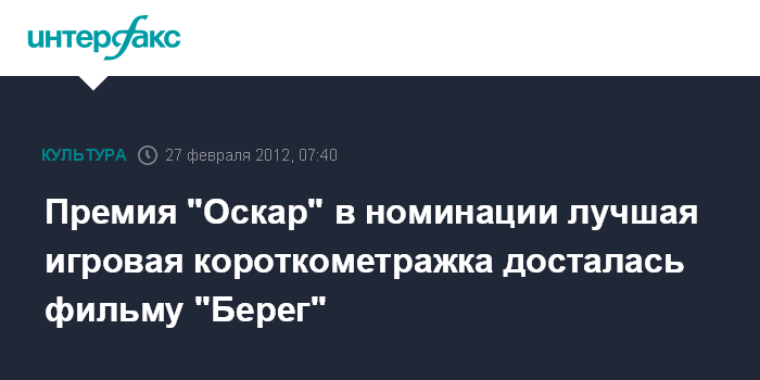Москва. 27 февраля. INTERFAX.RU – Награду киноакадемиков в номинации Лучший короткометражный игровой фильм получила лента "Берег" (The Shore).