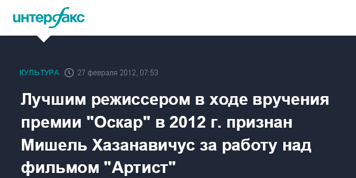 Москва. 27 февраля. INTERFAX.RU - Один из самых почетных кинопризов мира, "Оскар" в номинации Лучший режиссер получил Мишель Хазанавичус за работу над лентой "Артист". Эта номинация стала третьей победой фильма.