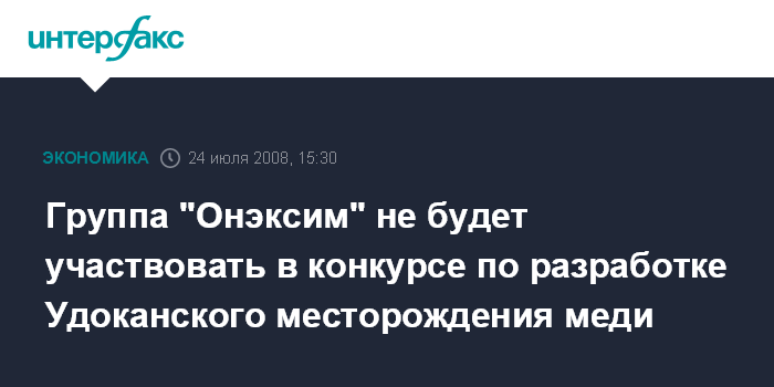Москва. 24 июля. INTERFAX.RU - Группа "Онэксим", управляющая активами Михаила Прохорова, отказалась от участия в конкурсе по разработке одного из крупнейших в мире месторождений меди - Удоканского.