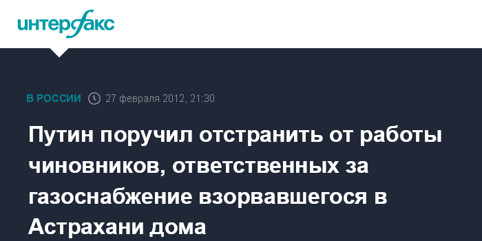 Москва. 27 февраля. INTERFAX.RU - Премьер-министр РФ Владимир Путин поручил до окончания расследования причин обрушения дома в Астрахани отстранить от должностей лиц, ответственных за контроль газовых сетей.