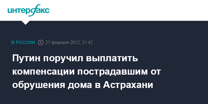 Москва. 27 февраля. INTERFAX.RU - Премьер-министр РФ Владимир Путин поставил задачу Минздравсоцразвития и Минфину подготовить правительственное поручение по выплате компенсации пострадавшим в ходе обрушения жилого дома в Астрахани.