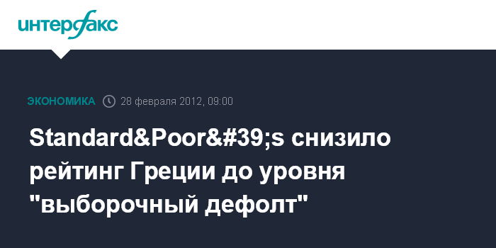 Лондон. 28 февраля. INTERFAX.RU - Международное рейтинговое агентство Standard & Poor's снизило в понедельник долгосрочный рейтинг Греции до уровня "выборочный дефолт" (SD) вслед за объявлением Афин о начале процесса реструктуризации долга.