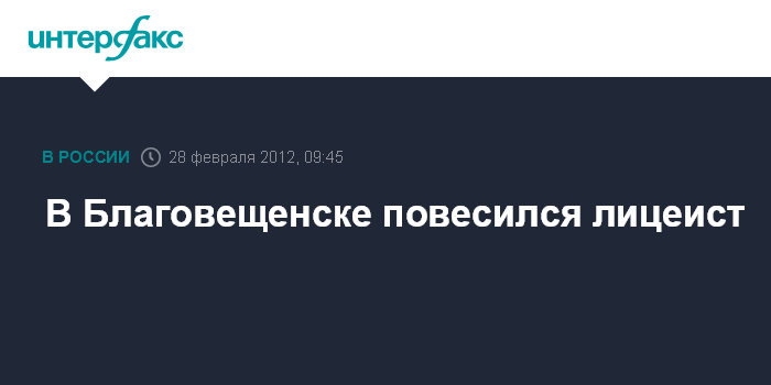 Благовещенск. 28 февраля. INTERFAX.RU - Учащийся одного из лицеев Благовещенска (Амурская область) был найден соседями по общежитию повесившимся в собственной комнате, сообщил агентству "Интерфакс - Дальний Восток" старший помощник руководителя СУ СК РФ по региону Алексей Лубинский во вторник.