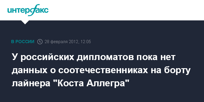 Москва. 28 февраля. INTERFAX.RU - Посольство России на Сейшельских островах пока не располагает подтвержденными данными о том, что на борту терпящего бедствие в Индийском океане лайнера "Коста Аллегра" есть граждане РФ.
