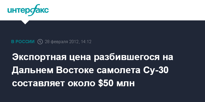 Экспортная цена разбившегося на Дальнем Востоке самолета Су-30 составляет около $50 млн