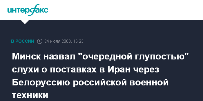 Минск. 24 июля. INTERFAX.RU - В министерстве обороны Белоруссии назвали "очередной глупостью" информацию, распространенную рядом белорусских интернет-СМИ со ссылкой на издание "Jerusalem Post" о поставках через Белоруссию в Иран российских систем С-300.