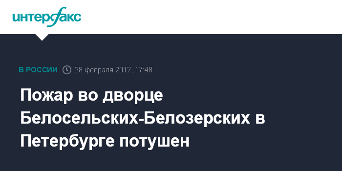 Санкт-Петербург. 28 февраля. INTERFAX.RU - Пожарные полностью завершили работы во дворце Белосельских-Белозерских в Петербурге, где во вторник днем вспыхнул пожар, сообщили "Интерфаксу" в пресс-службе Главного управления МЧС по городу. Огонь был потушен в 17:24.