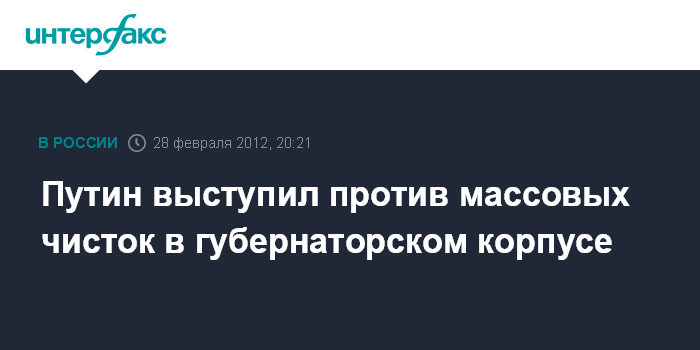 Уфа. 28 февраля. INTERFAX.RU - Премьер РФ Владимир Путин против массовых чисток губернаторского корпуса, но признает наличие кадровых проблем в этой сфере.