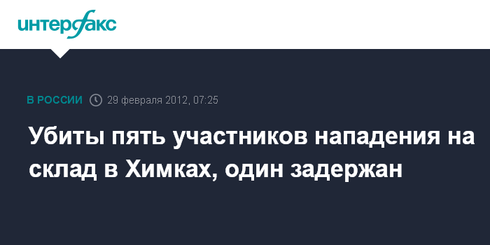 Москва. 29 февраля. ИНТЕРФАКС - По официальным данным полиции, в ходе нападения на склад в подмосковных Химках убиты пять злоумышленников, один задержан, получил ранение сотрудник спецподразделения, сообщил "Интерфаксу" официального представитель ГУ МВД РФ по Московской области Евгений Гильдеев.