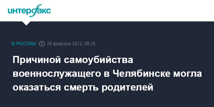 Челябинск. 29 февраля. INTERFAX.RU - Причиной суицида солдата-контрактника, который был найден повешенным в общежитии Челябинска, могла стать смерть родителей, сообщил представитель следственного управления СКР по Челябинской области Валентин Ведерников.