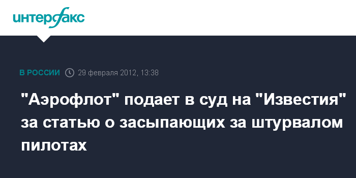 Москва. 29 февраля. INTERFAX.RU - Авиакомпания "Аэрофлот" опровергла информацию, опубликованную в газете "Известия", о том, что пилоты компании засыпают во время полетов, и заявила о подаче иска в суд, сообщили в пресс-службе авиаперевозчика.