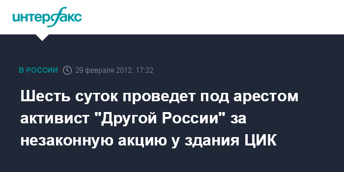 Москва. 29 февраля. INTERFAX.RU - Суд приговорил к шести суткам ареста одного из участников протестной акции, которую оппозиция провела накануне у здания ЦИК РФ в Москве.