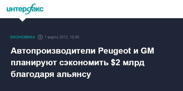 Москва. 1 марта. INTERFAX.RU - Экономия от синергии после заключения альянса французского автомобилестроительного концерна PSA Peugeot Citroen и американского автопроизводителя General Motors Co. (GM) оценивается компаниями в $2 млрд, сообщает агентство Bloomberg со ссылкой на двух источников, близких к компаниям.