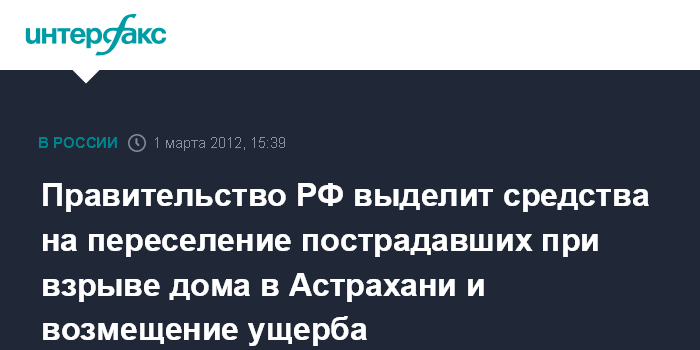 Москва. 1 марта. INTERFAX.RU - Премьер-министр РФ Владимир Путин заявил, что на переселение пострадавших в результате взрыва газа в доме в Астрахани будет выделено 350 млн рублей и для компенсаций ущерба 36 млн рублей.