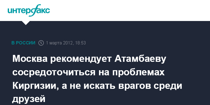 Москва. 1 марта. INTERFAX.RU - В Кремле советуют президенту Киргизии Алмазбеку Атамбаеву прежде, чем искать врагов среди друзей и партнеров, сконцентрироваться на решении внутренних проблем и разобраться с иностранными объектами в своей собственной стране.