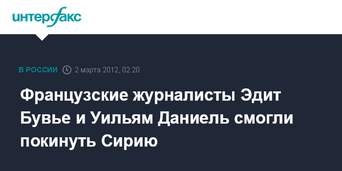 Париж. 2 марта. ИНТЕРФАКС - Французские журналисты Эдит Бувье и Уильям Даниель, которые в течение несколько дней не могли покинуть обстреливаемый правительственной армией сирийский город Хомс, были переправлены в Ливан, сообщил президент Франции Николя Саркози в четверг в Брюсселе.