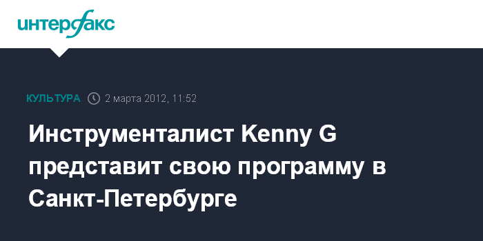 Санкт-Петербург. 2 марта. INTERFAX.RU - Известный американский скасофонист-виртуоз обладатель премии Grammy Kenny G, спешит снова порадовать зрителей полноформатной концертной программой в Санкт-Петербурге.