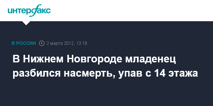 Нижний Новгород. 2 марта. INTERFAX.RU - Следователи выясняют обстоятельства гибели 4-месячного мальчика при падении из квартиры многоэтажного дома в Канавинском районе Нижнего Новгорода.