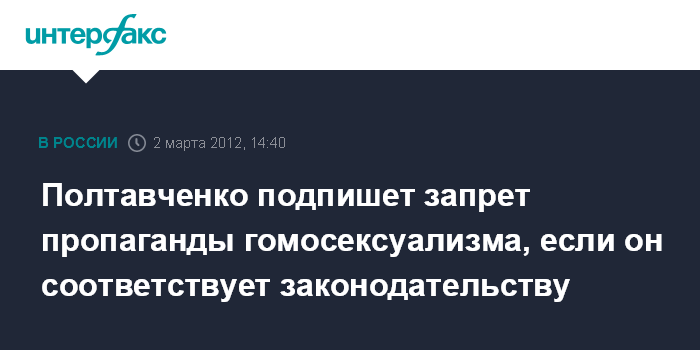 Санкт-Петербург. 2 марта. INTERFAX.RU - Губернатор Петербурга Георгий Полтавченко заявил, что пока не получал принятый в среду депутатами Законодательного Собрания города закон о запрете пропаганды гомосексуализма и педофилии, который должны были предоставить ему на подпись.