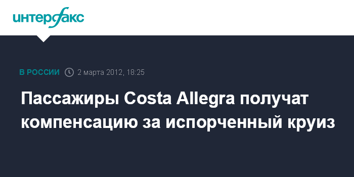 Рим. 2 марта. INTERFAX.RU - Все пассажиры судна Costa Allegra, потерпевшего аварию близ Сейшельских островов, получат компенсации от компании-судовладельца Costa Crociere, сообщает официальный сайт круизного оператора.