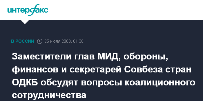 Москва. 25 июля. ИНТЕРФАКС-АВН - Консультации представителей государств-членов Организации Договора по вопросам коллективной безопасности на уровне заместителей министров иностранных дел, обороны, финансов и заместителей секретарей Советов безопасности состоятся 25 июля в Москве.