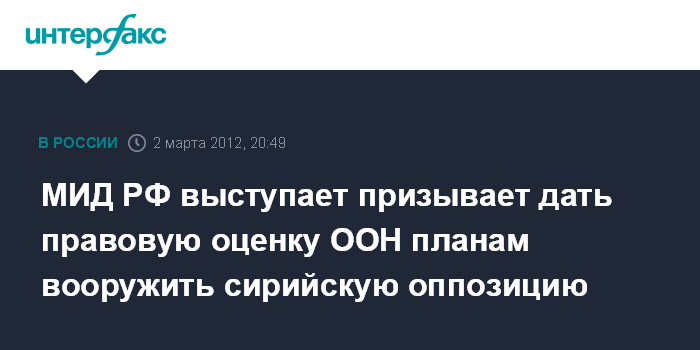 Москва. 2 марта. INTERFAX.RU - Официальный представитель МИД РФ заявил, что структуры ООН должны дать правовую оценку высказываниям официальных лиц разных стран, выступающих за вооружение боевых отрядов сирийской оппозиции.